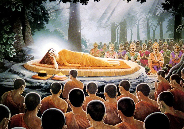 佛陀晚年疾病缠身,仍然到处讲经说法。来到拘尸那伽城外的娑罗树林,佛陀疲乏不堪,决定在这里入灭。在两株娑罗树中间,阿难搀扶佛陀右胁而卧,还对外道须跋陀罗说法,这是最后度化的弟子,说完便寂然入定,安祥而逝。这是公元前五四三年二月十五日中夜,佛陀寿八十岁。