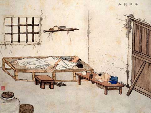 吴猛,晋朝濮阳人,八岁时就懂得孝敬父母。家里贫穷,没有蚊帐,蚊虫叮咬使父亲不能安睡。每到夏夜,吴猛总是赤身坐在父亲床前,任蚊虫叮咬而不驱赶,担心蚊虫离开自己去叮咬父亲。